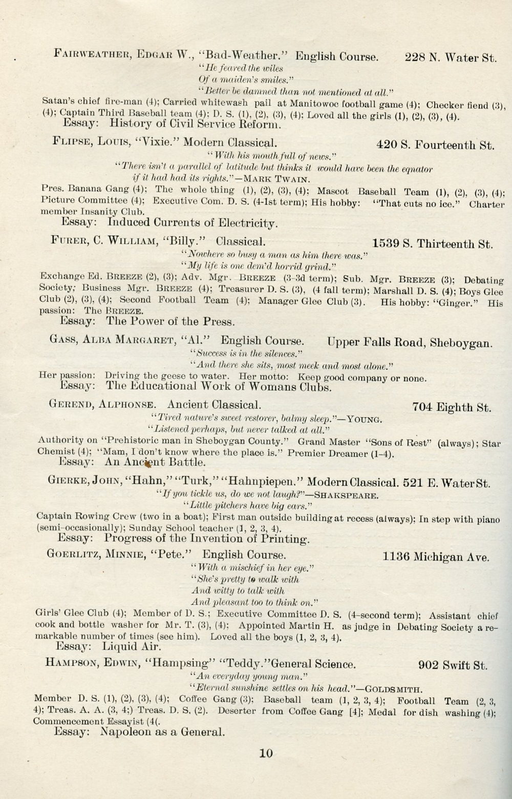 1899 Sheboygan High School, Page 10: Edgar W. Fairweather, Louis Flipse, C. William Furer, Alba Margaret Gass, Alphonse Gerend, John Gherke, Minnie Goerlitz, Edwin Hampson.