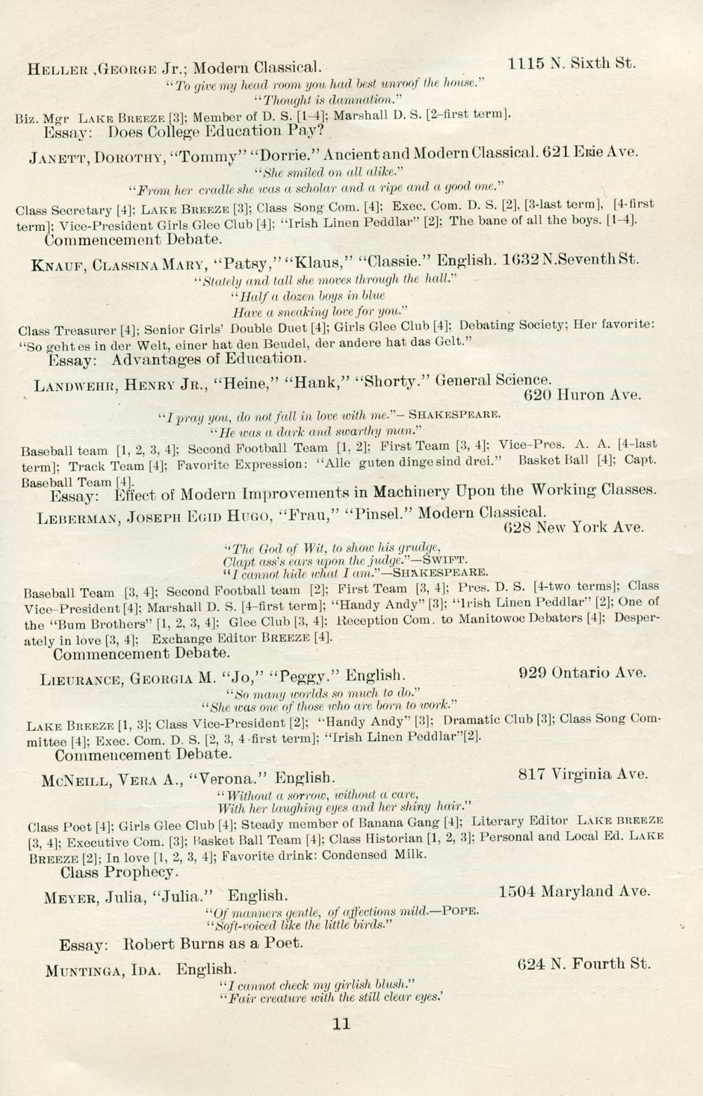 1899 Sheboygan High School, Page 11: George Heller Jr., Dorothy Janett, Classina Mary Knauf, Henry Landwehr Jr., Joseph Egid Hugo Leberman, Georgia M. Lieurance, Vera A. McNeill, Julia Meyer, Ida Muntinga.