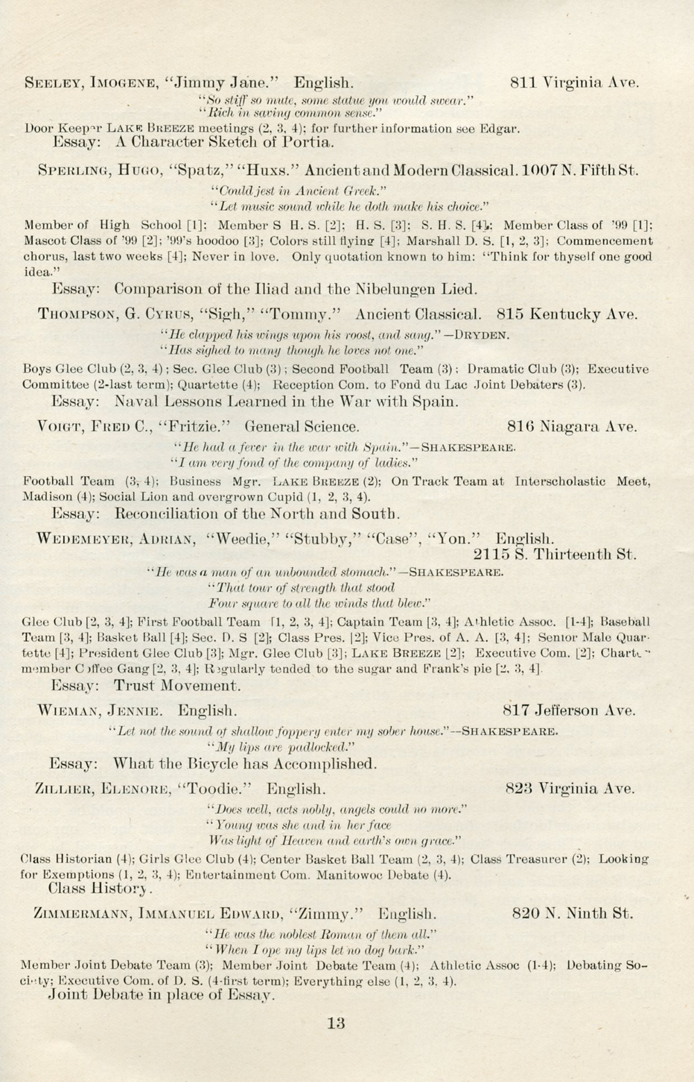 1899 Sheboygan High School, Page 13: Imogene Seeley, Hugo Sperling, G. Cyrus Thompson, Fred C. Voigt, Adrian Wedemeyer, Jennie Wieman, Elenore Zillier, Immanuel Edward Zimmermann.
