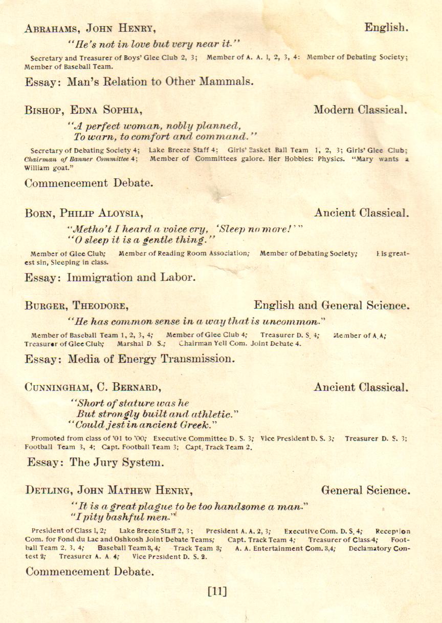 1900 Sheboygan High School, Pages 8, 10 and 11. John Abrahams, Edna Bishop, Philip Born, Theodore Burger, Bernard Cunningham, John Detling.