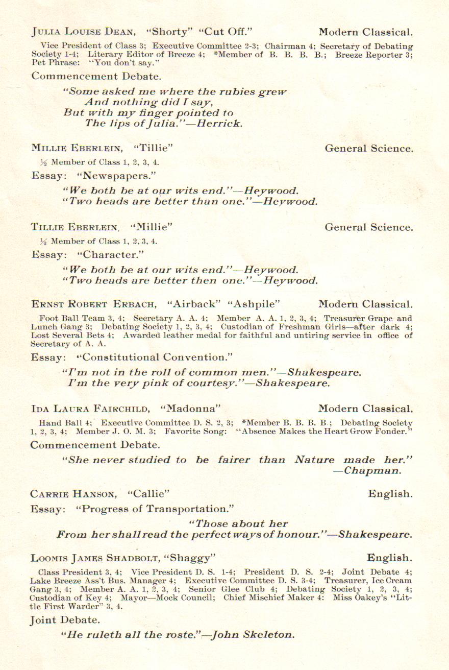 1901 Sheboygan High School: Julia Dean, Millie Everlein, Tillie Eberlein, Ernst Erbach, Ida Fairchild, Carrie Hanson, Loomis Shadbolt.