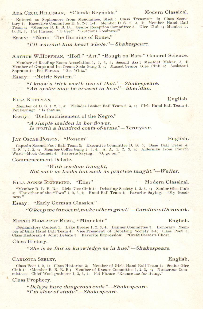 1901 Sheboygan High School: Ada Hilleman, Arthur Hoffman, Ella Kuhlman, Jay Posson, Ella Reineking, Minnie Riess, Carlotta Seele.