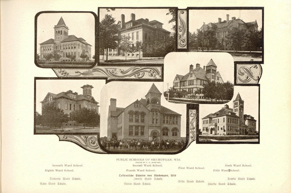 1905 Sheboygan County Souvenir Page 11: Public Schools of Sheboygan, Wis. Seventh Ward School, Eighth Ward School, Second Ward School, Fourth Wards School, First Ward School, Sixth Ward School, Fifth Ward School