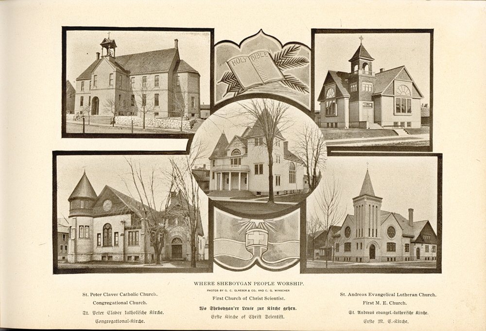 1905 Sheboygan County Souvenir Page 15: Where Sheboygan People Worship, St. Peter Claver Catholic Church, Congregational Church, First Church of Christ Scientist, St. Andrews Evangelical Lutheran church, First M. E. Church