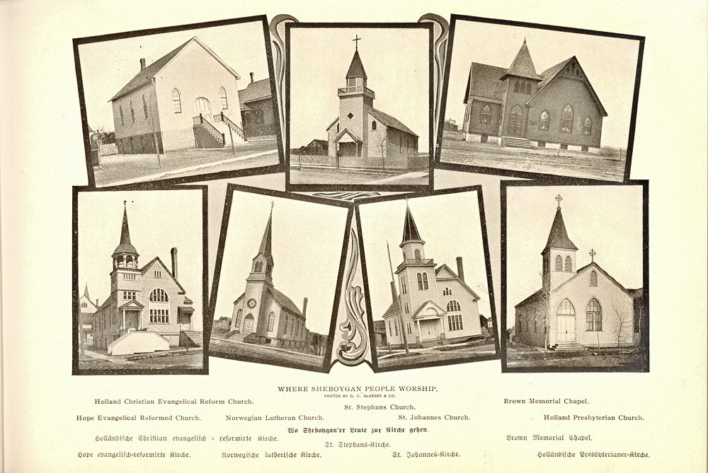 1905 Sheboygan County Souvenir Page 17: Where Sheboygan People Worship, Holland Christian Evangelical Reform Church, Hope Evangelical Reformed Church, Norwegian Lutheran Church, St. Stephens Church, St. Johannes Church, Brown Memorial Chapel, Holland Presbyterian Church