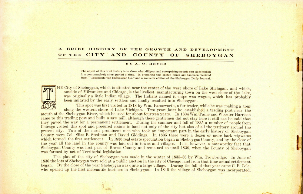 1905 Sheboygan County Souvenir Page 2: A brief History of the Growth and Development of the City and County of Sheboygan