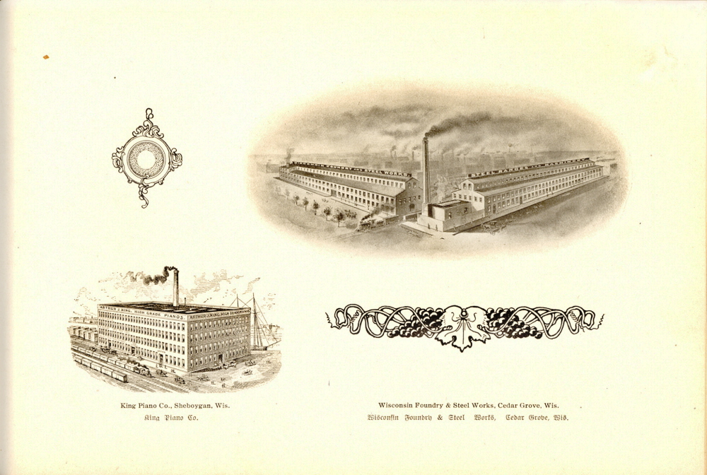 1905 Sheboygan County Souvenir Page 39: King Piano Co., Sheboygan, Wis., Wisconsin Foundry & Steel Works, Cedar Grove, Wis.