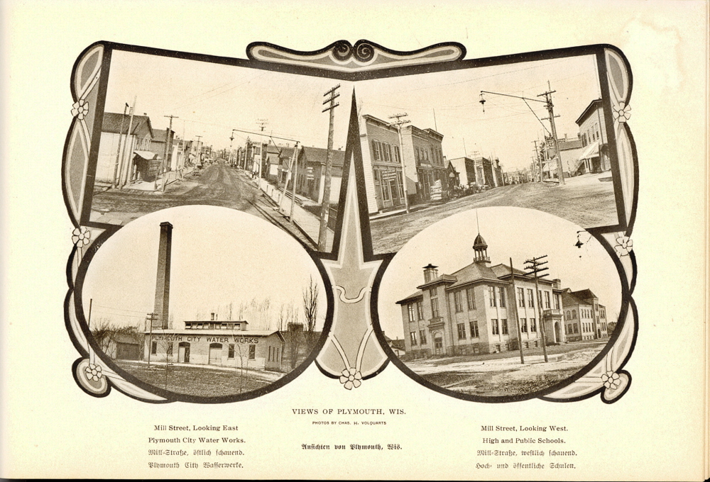 1905 Sheboygan County Souvenir Page 41: Views of Plymouth, Wis. Mill Street, Looking East, Plymouth City Water Works, Mill Street, Looking West, High and Public Schools
