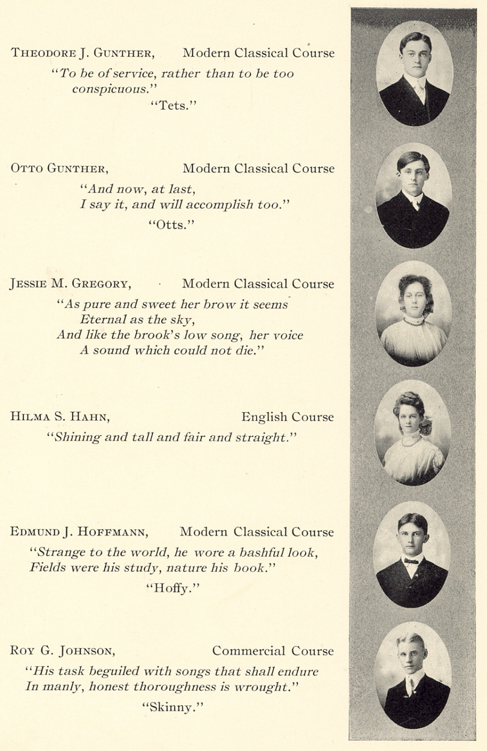 1905 Sheboygan High School, Page 9: Theodore J. Gunther, Otto Gunther, Jessie M. Gregory, Hilma S. Hahn, Edmund J. Hoffmann, Roy G. Johnson.