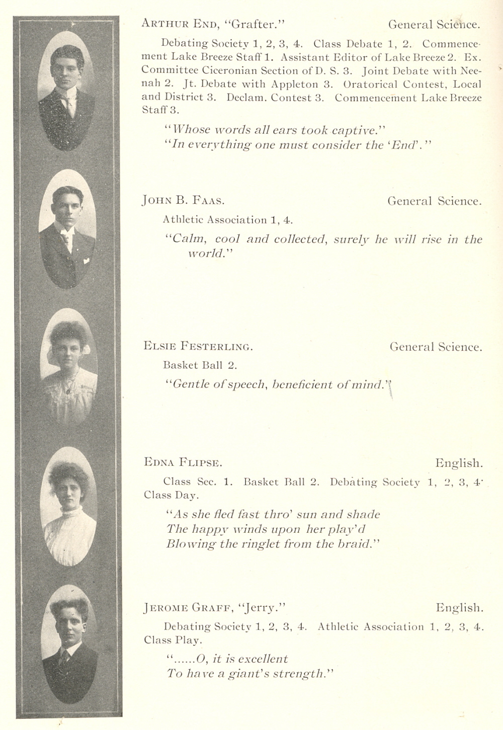 1907 Sheboygan High School, Page 10: Arthur End, John Faas, Elsie Festerling, Edna Flipse, Jerome Graff.