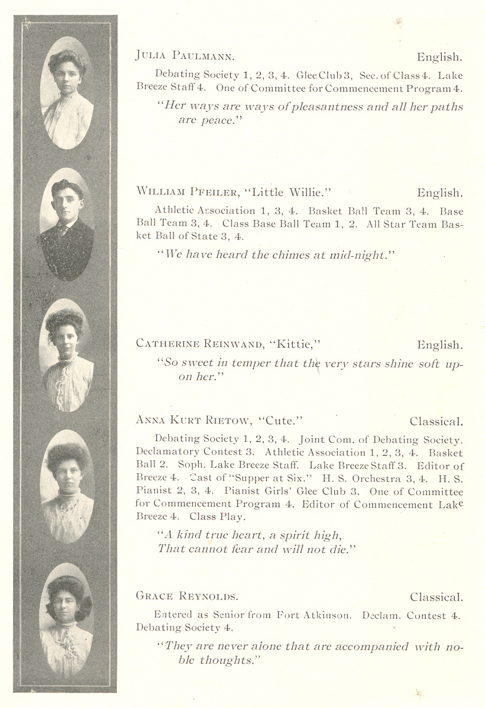 1907 Sheboygan High School, Page 13: Julia Paulmann, William Pfeiler, Catherine Reinwand, Anna Rietow, Grace Reynolds.