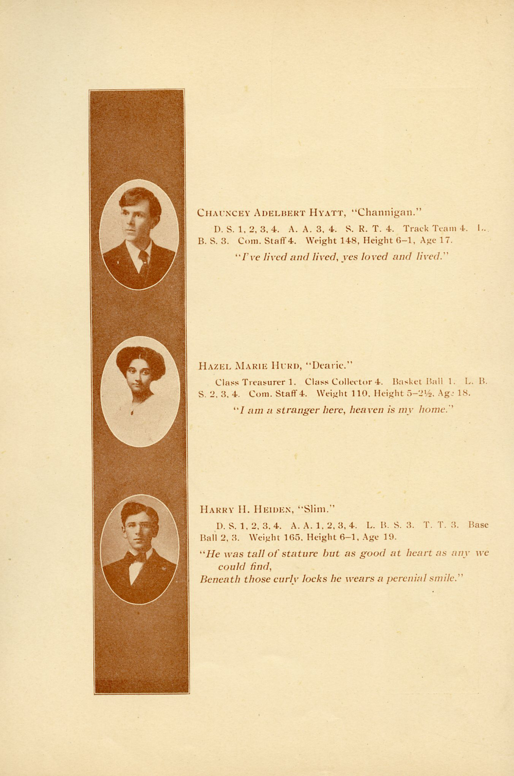 1908 Sheboygan High School, Page 13: Chauncey Adelbert Hyatt, Hazel Marie Hurd, Harry H. Heiden.
