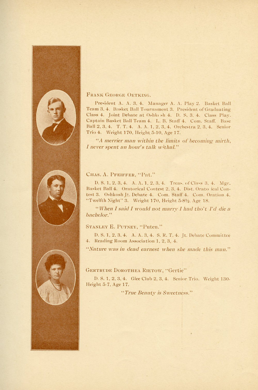 1908 Sheboygan High School, Page 16: Frank George Oetking, Chas. A. Pfeiffer, Stanley E. Putney, Gertrude Dorothea Rietow.