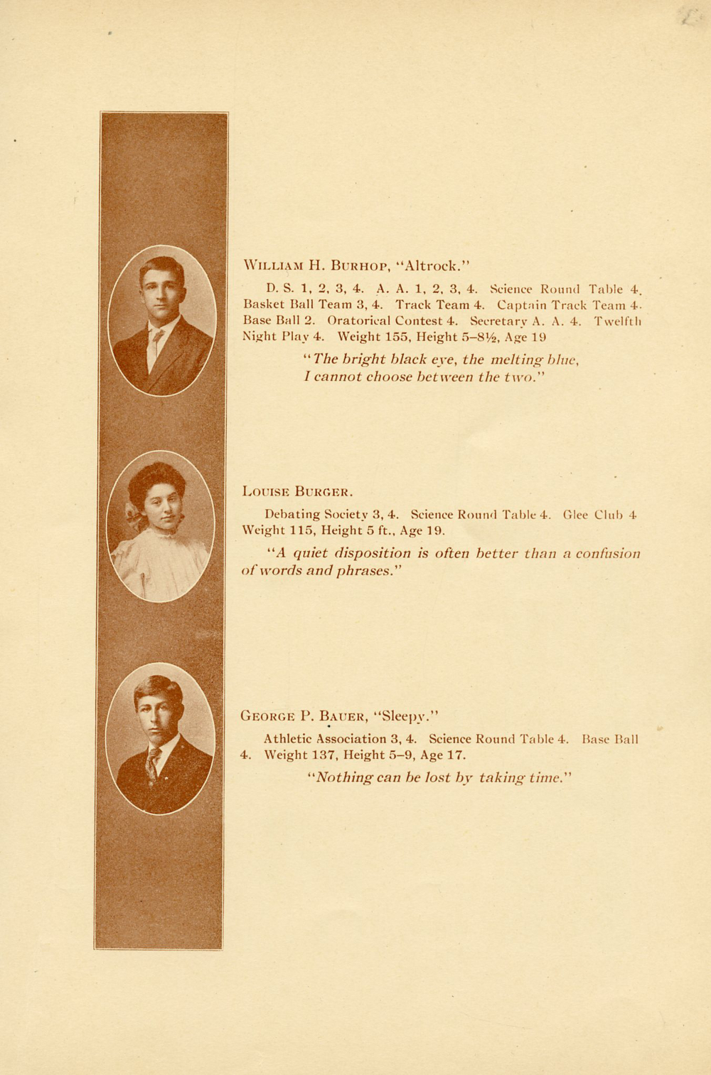 1908 Sheboygan High School, Page 8: William H. Burhop, Louise Burger, George P. Bauer.