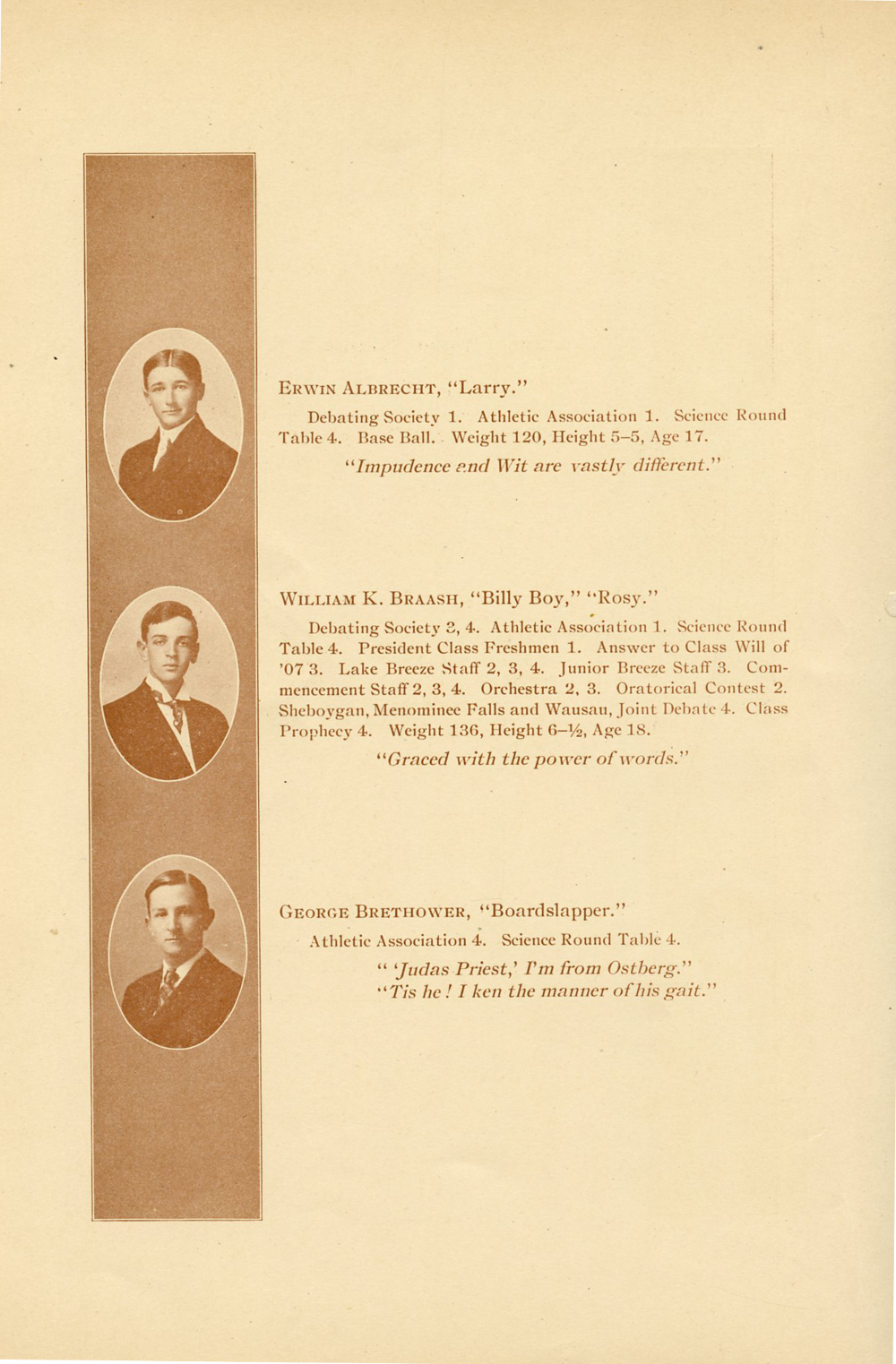 1908 Sheboygan High School, Page 9: Erwin Albrecht, William K. Braash, Geoge Brethower.