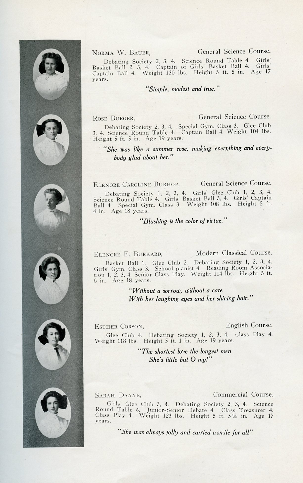 1910 Sheboygan High School Yearbook Page 8: Norma W. Bauer, Rose Burger, Elenore Caroline Burhop, Elenore E. Burkard, Esther Corson, Sarah Daane.