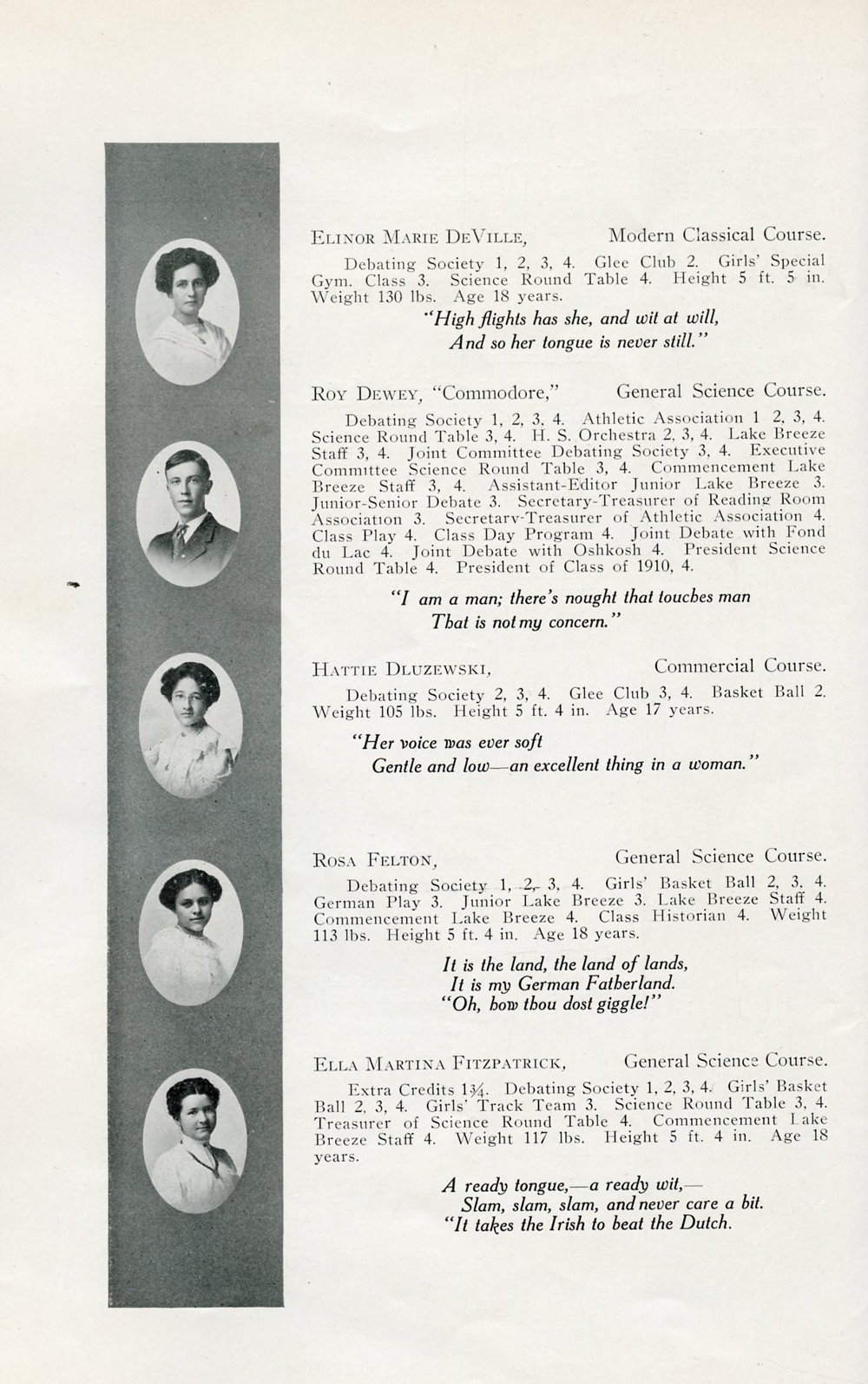 1910 Sheboygan High School Page 9: Elinor Marie DeVille, Roy Dewey, Hattie Dluzewski, Rosa Felton, Ella Martina Fitzpatrick.