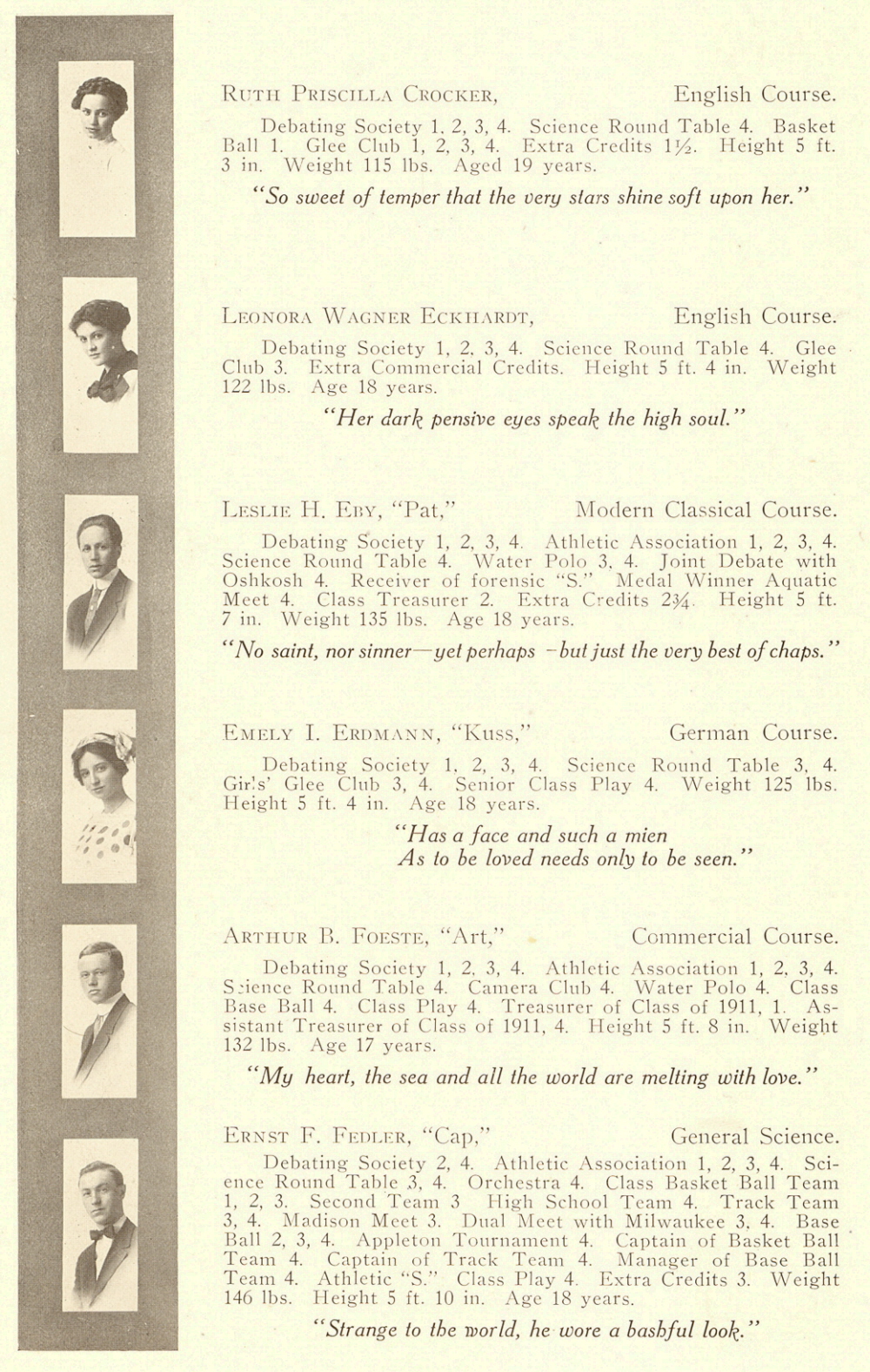 1911 Sheboygan High School, Page 10: Ruth Priscilla Crocker, Leonora Wagner Eckhardt, Leslie H. Eby, Emely I. Erdmann, Arthur B. Foeste, Ernst F. Fedler.