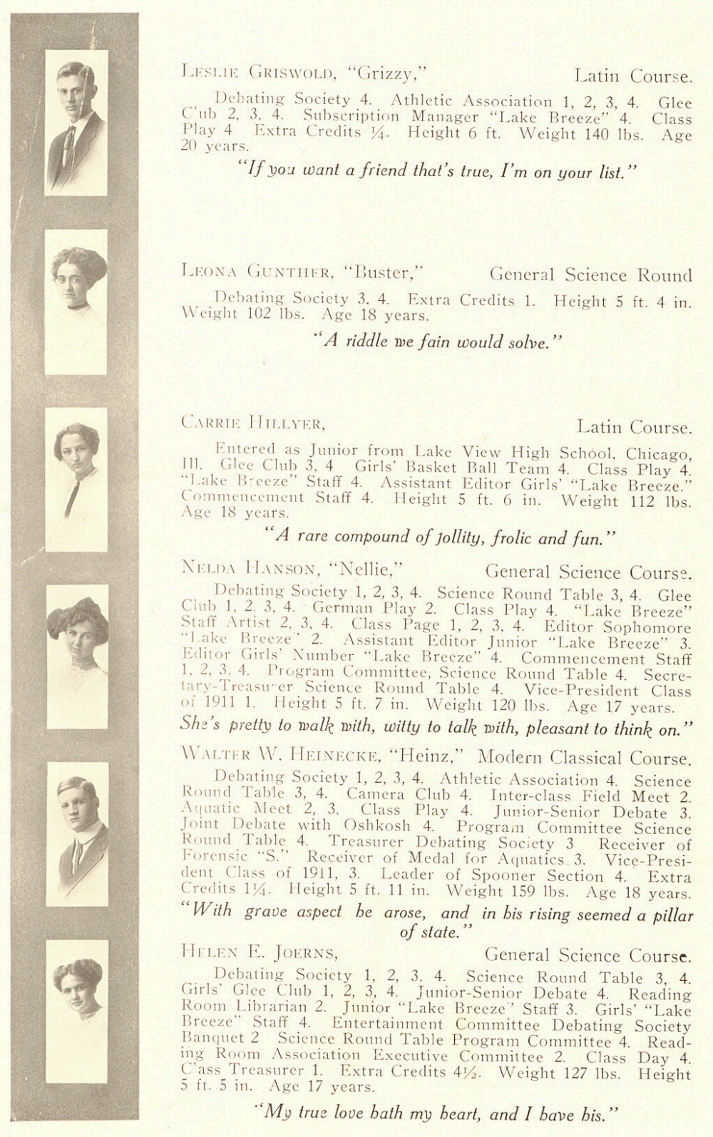 1911 Sheboygan High School, Page 11: Leslie Griswold, Leona Gunther, Carrie Hillyer, Nelda Hanson, Walter W. Heinecke, Helen E. Joerns.