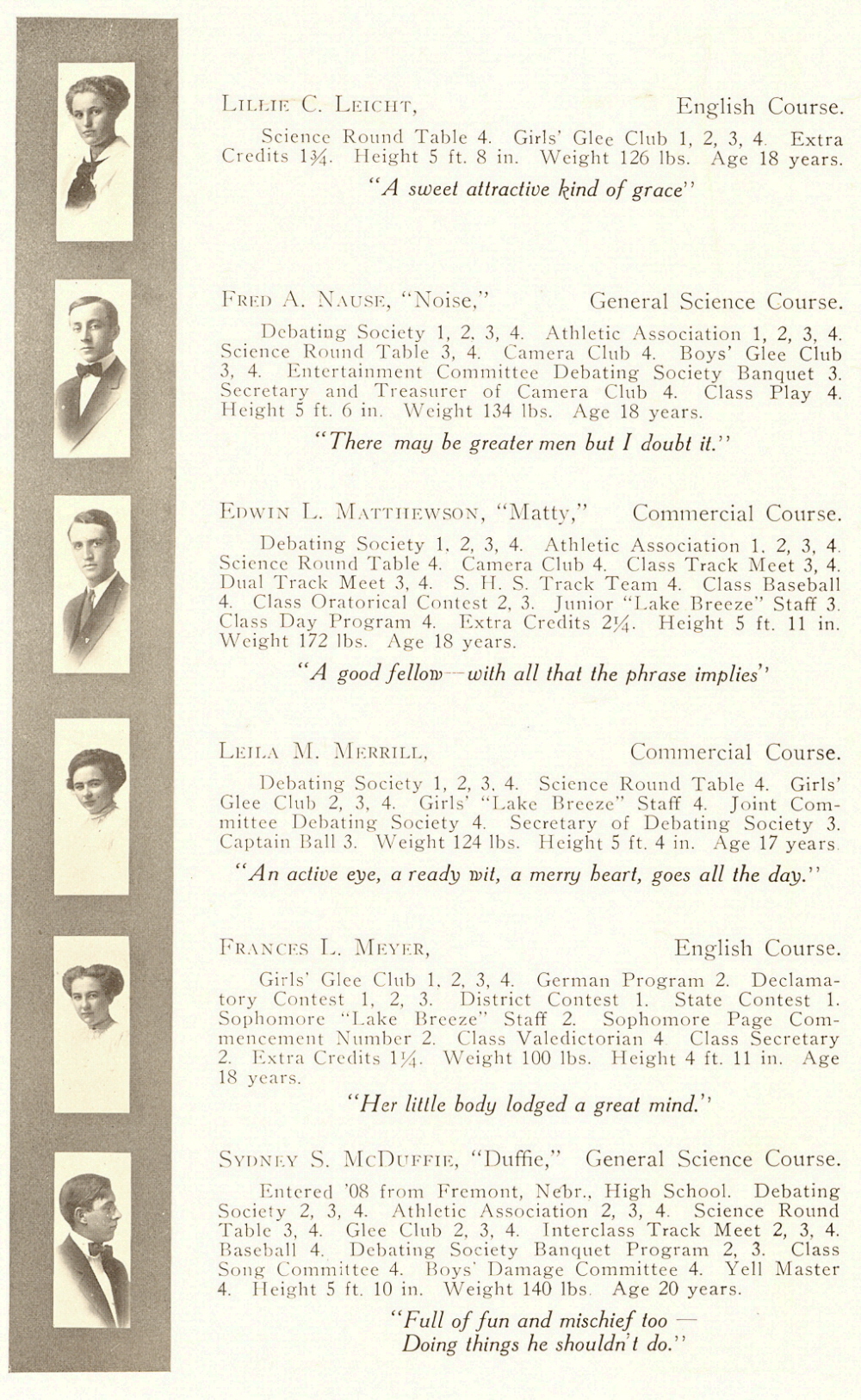 1911 Sheboygan High School, Page 14: Lillie C. Leicht, Fred A. Nause, Edwin L. Matthewson, Leila M. Merrill, Frances L. Meyer, Sydney S. McDuffie.