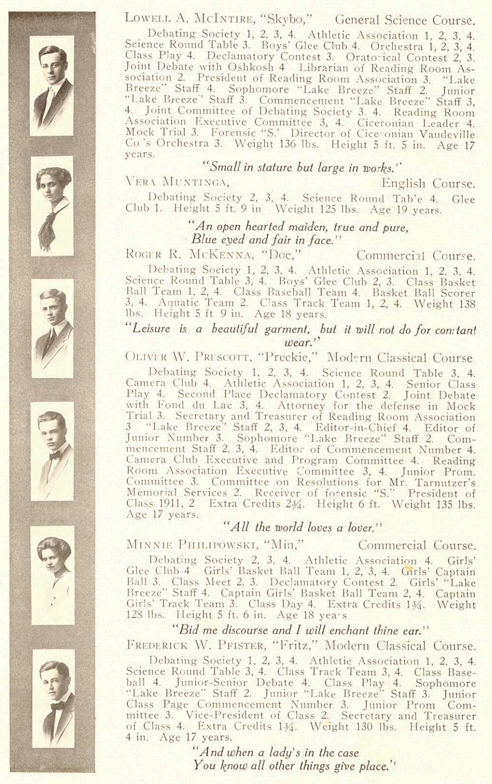 1911 Sheboygan High School, Page 15: Lowell A. McIntire, Vera Muntinga, Roger R. McKenna, Oliver W. Prescott, Minnie Philipowski, Frederick W. Pfister.