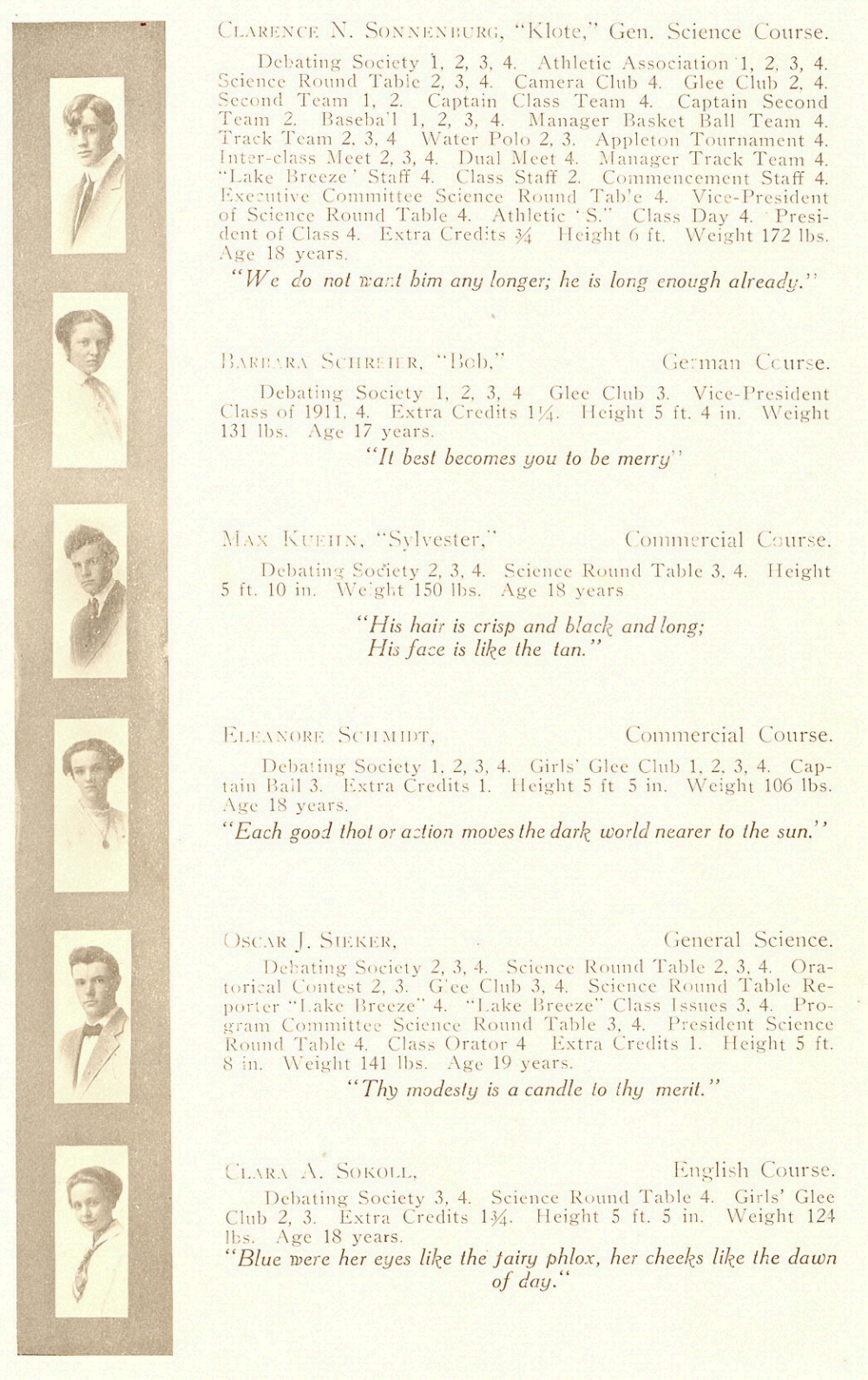 1911 Sheboygan High School, Page 17: Clarence N. Sonnenburg, Barbara Schreier, Max Kuehn, Eleanore Schmidt, Oscar J. Sieker, Clara A. Sokoll.