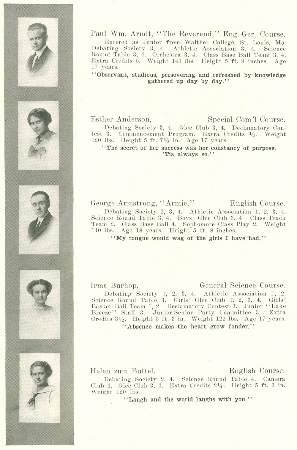 1912 Sheboygan High School, Page 1: Paul Arndt, Esther Anderson, George Armstrong, Irma Burhop, Helen zum Buttel.