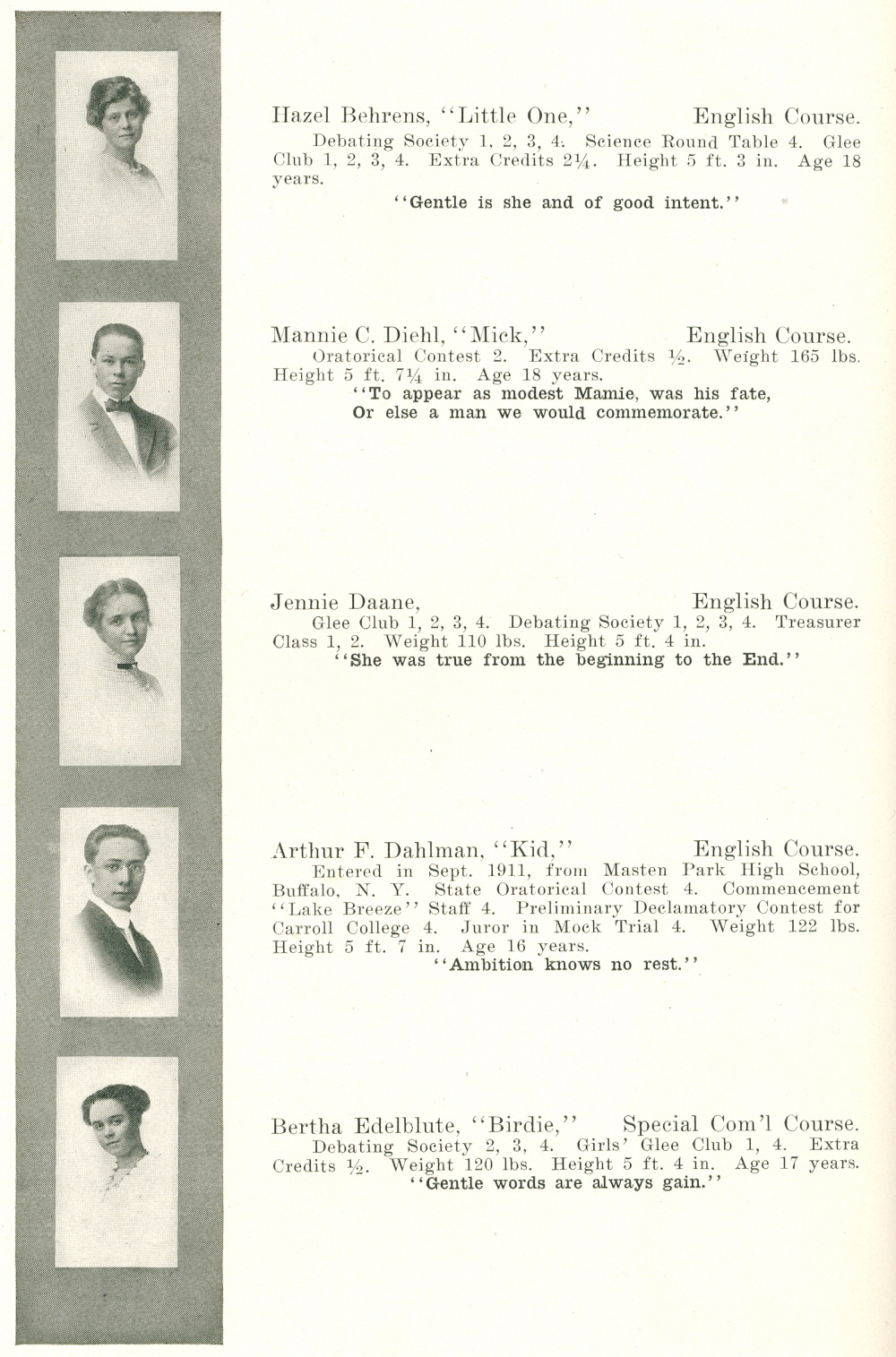 1912 Sheboygan High School, Page 2: Hazel Behrens, Mannie C. Diehl, Jennie Daane, Arthur F. Dahlman, Bertha Edelblute.