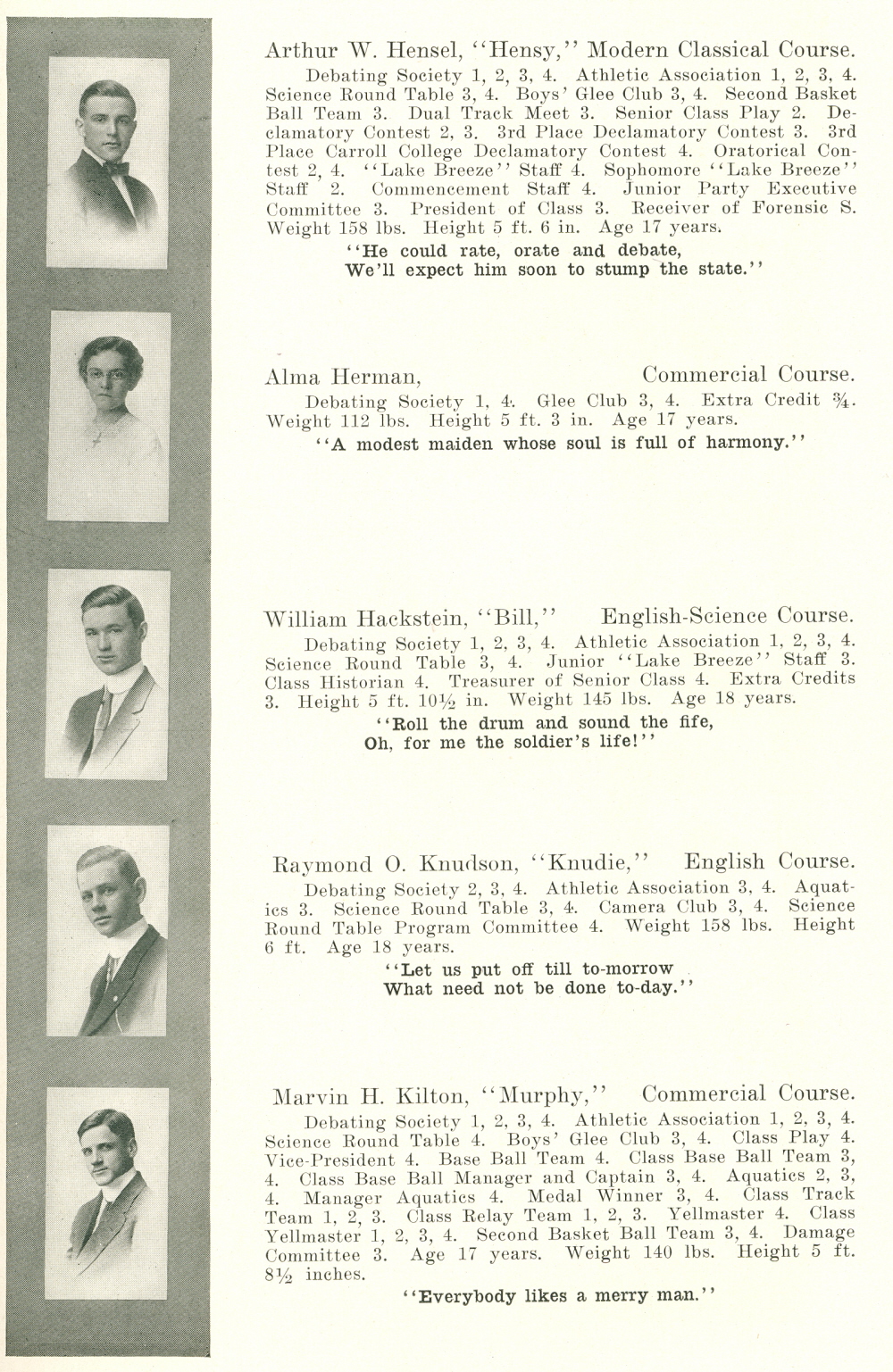 1912 Sheboygan High School, Page 5: Arthur W. Hensel, Alma Herman, William Hackstein, Raymond O. Knudson, Marvin H. Kilton.