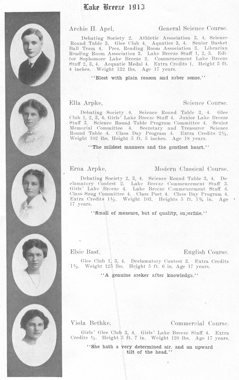 1913 Sheboygan High School, Page 10: Archie H. Apel, Ella Arpke, Erna Arpke, Elsie Bast, Viola Bethke.