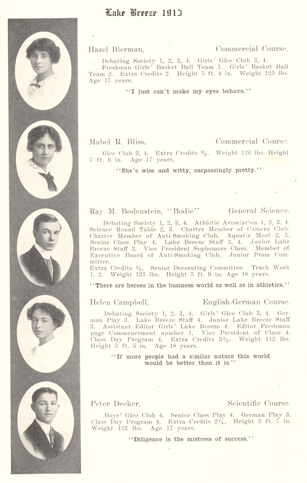 1913 Sheboygan High School, Page 11: Hazel Bierman, Mabel R. Bliss, Ray M. Bodenstein, Helen Campbell, Peter Decker.