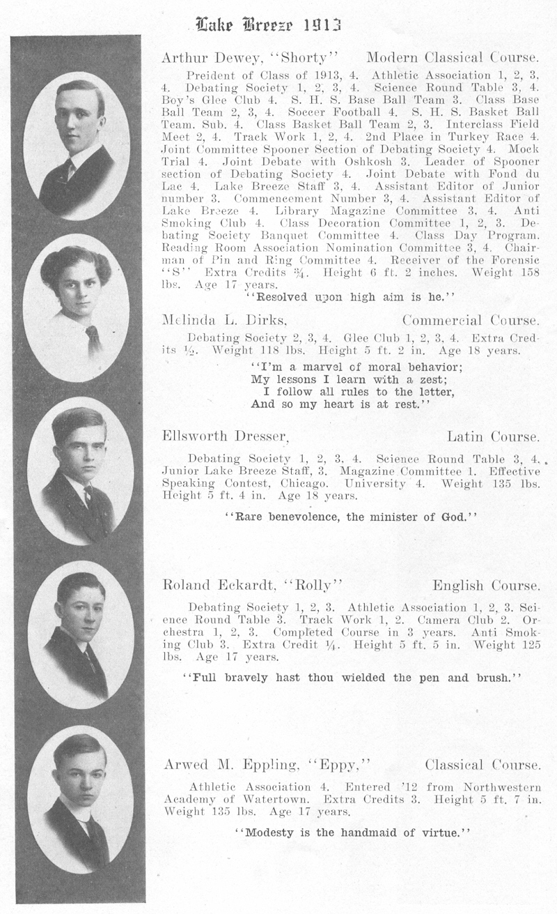 1913 Sheboygan High School, Page 12: Arthur Dewey, Melinda L. Dirks, Ellsworth Dresser, Roland Eckardt, Arwed M. Eppling.