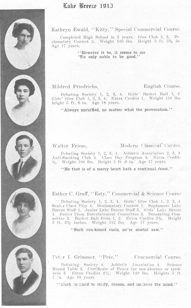 1913 Sheboygan High School, Page 13: Kathryn Ewald, Mildred Friedrichs, Walter Friese, Esther C. Graff, Peter Grimmer.