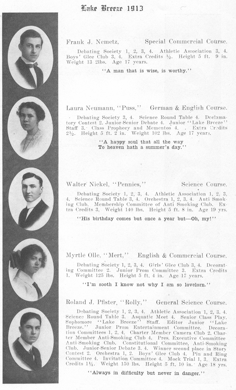1913 Sheboygan High School, Page 18: Frank Nemetz, Laura Neumann, Walter Nickel, Myrtle Olle, Roland Pfister.
