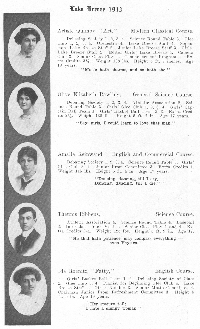 1913 Sheboygan High School, Page 19: Arlisle Quimby, Olive Rawling, Amalia Reinwand, Theunis Ribbens, Ida Roenitz.