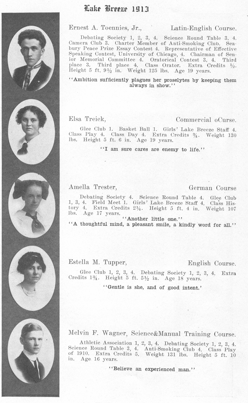 1913 Sheboygan High School, Page 22: Ernest Toennies, Elsa Trieck, Amella Trester, Estella Tupper, Melvin Wagner.