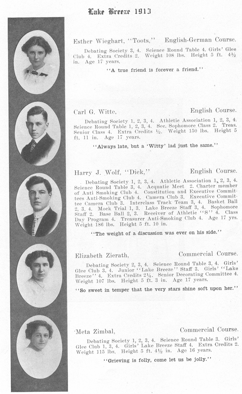 1913 Sheboygan High School, Page 23: Esther Wieghart, Carl Witte, Harry Wolf, Elizabeth Zierath, Meta Zimbal.