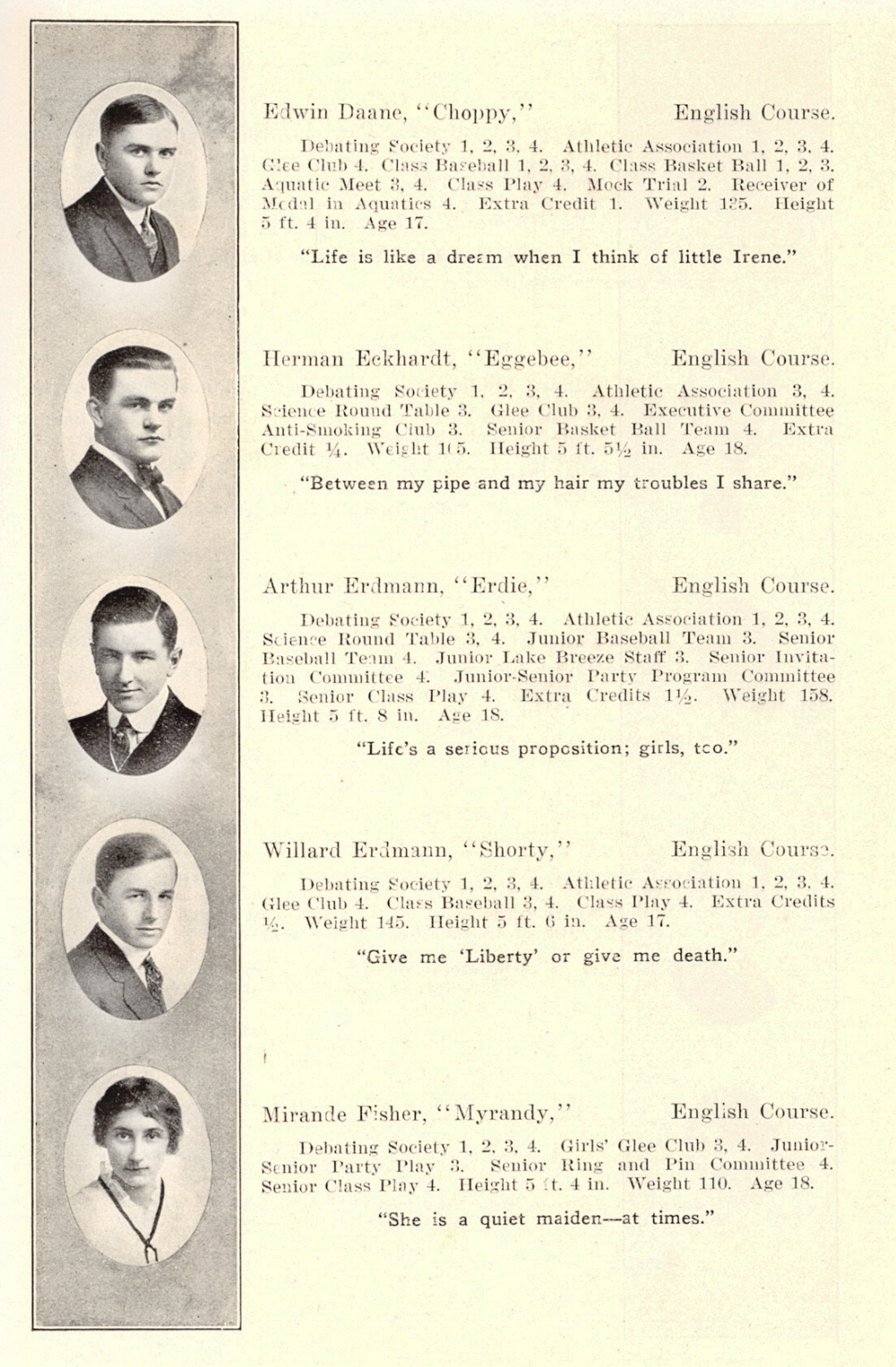 1914 Sheboygan High School, Page 13: Edwin Daane, Herman Eckhardt, Arthur Erdmann, Willard Erdmann, Mirande Fisher.