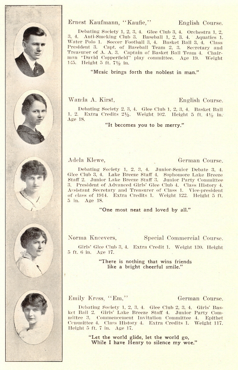 1914 Sheboygan High School, Page 17: Ernest Kaufmann, Wanda A. Kirst, Adela Klewe, Norma Kneevers, Emily Kress.