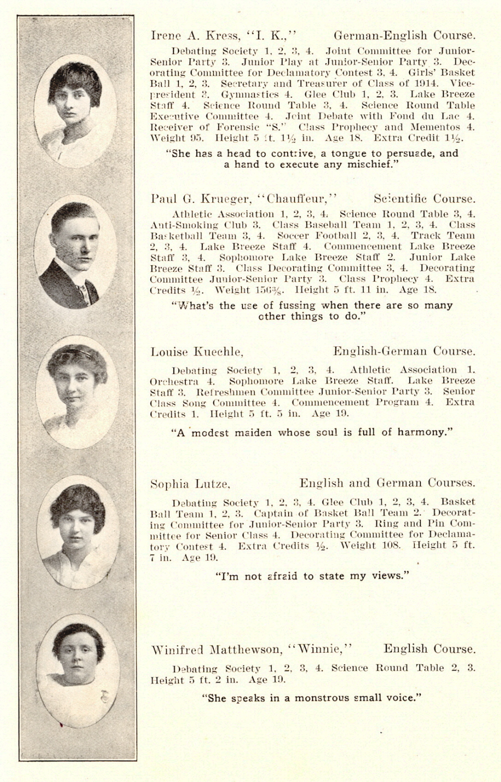 1914 Sheboygan High School, Page 18: Irene A. Kress, Paul G. Krueger, Louise Kuechle, Sophia Lutze, Winifred Matthewson.