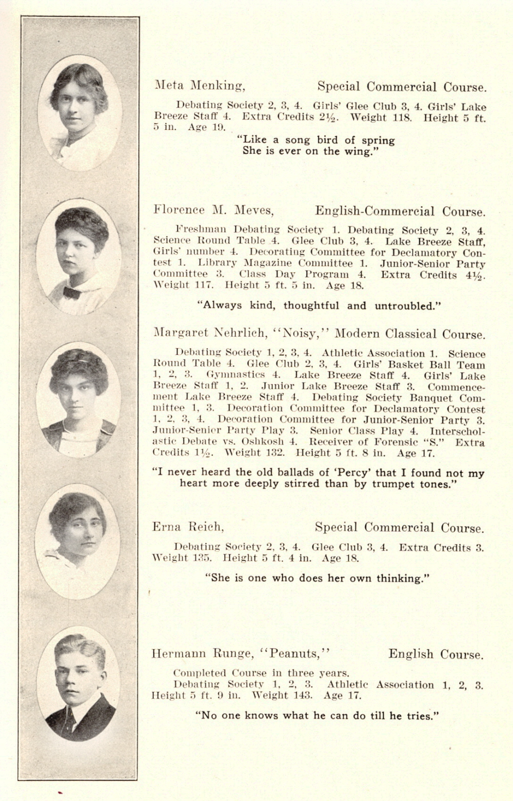1914 Sheboygan High School, Page 19: Meta Menking, Florence M. Meves, Margaret Nehrlich, Erna Reich, Hermann Runge.