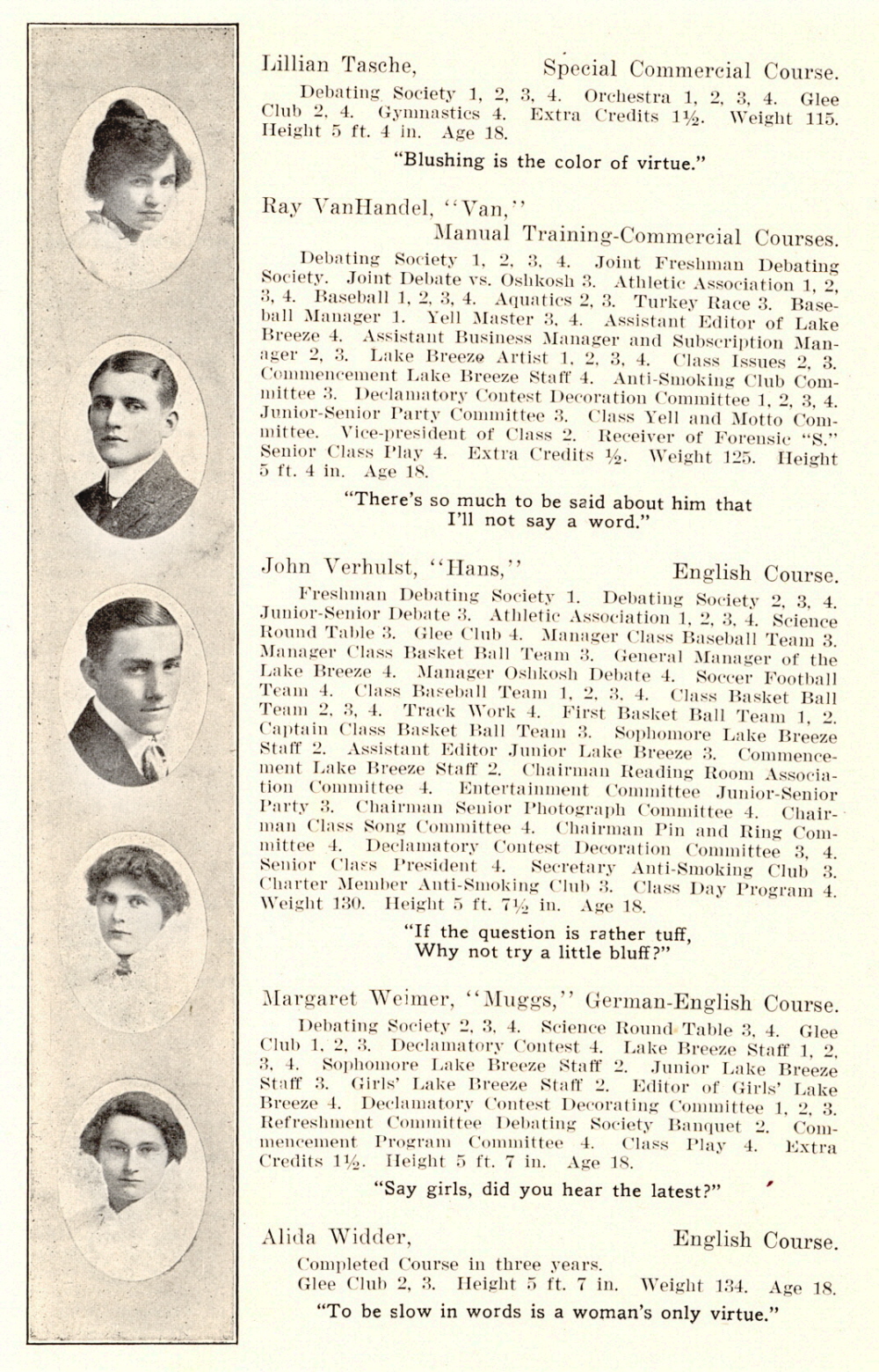 1914 Sheboygan High School, Page 22: Lillian Tasche, Ray VanHandel, John Verhulst, Margaret Weimer, Alida Widder.