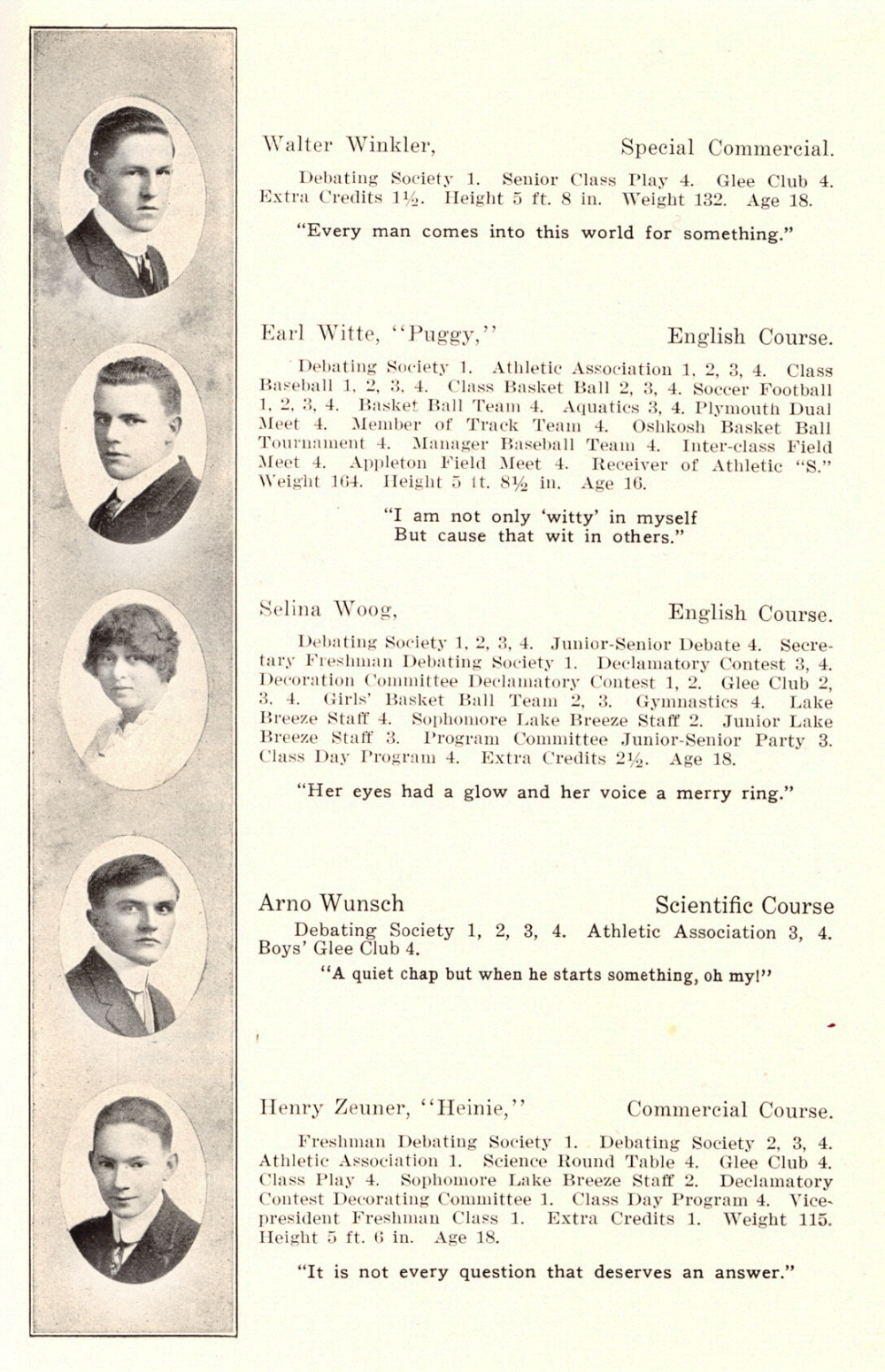 1914 Sheboygan High School, Page 23: Walter Winkler, Earl Witte, Selina Woog, Arno Wunsch, Henry Zeuner.