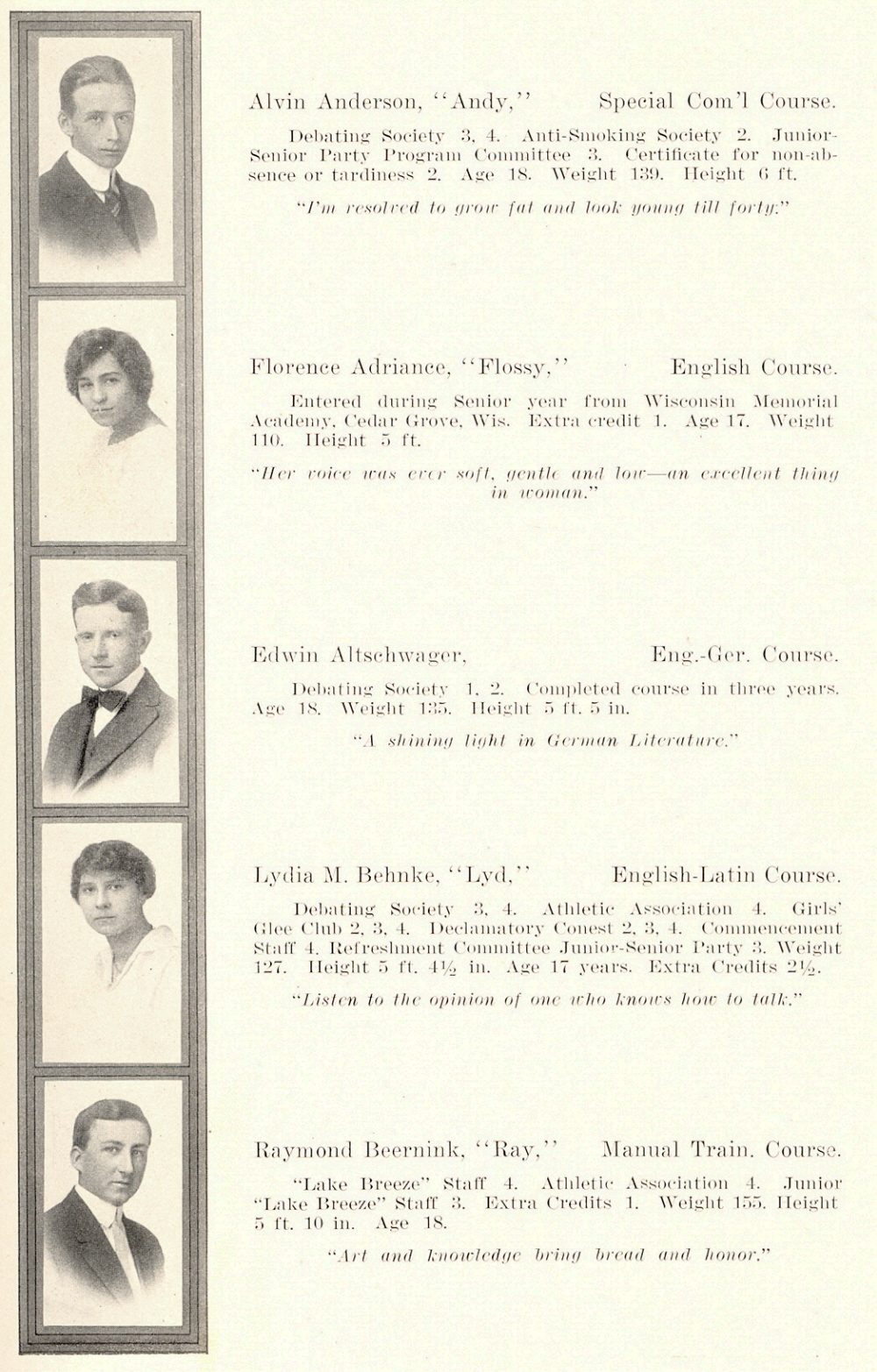 1915 Sheboygan High School, Page 11: Alvin Anderson, Florence Adriance, Edwin Altschwager, Lydia M. Behnke, Raymond Beernink.