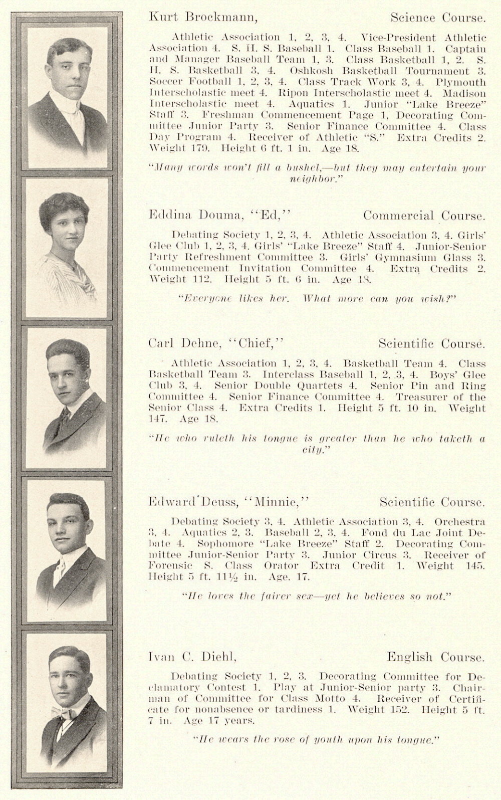 1915 Sheboygan High School, Page 12: Kurt Brockmann, Eddina Douma, Carl Dehne, Edward Deuss, Ivan C. Diehl.