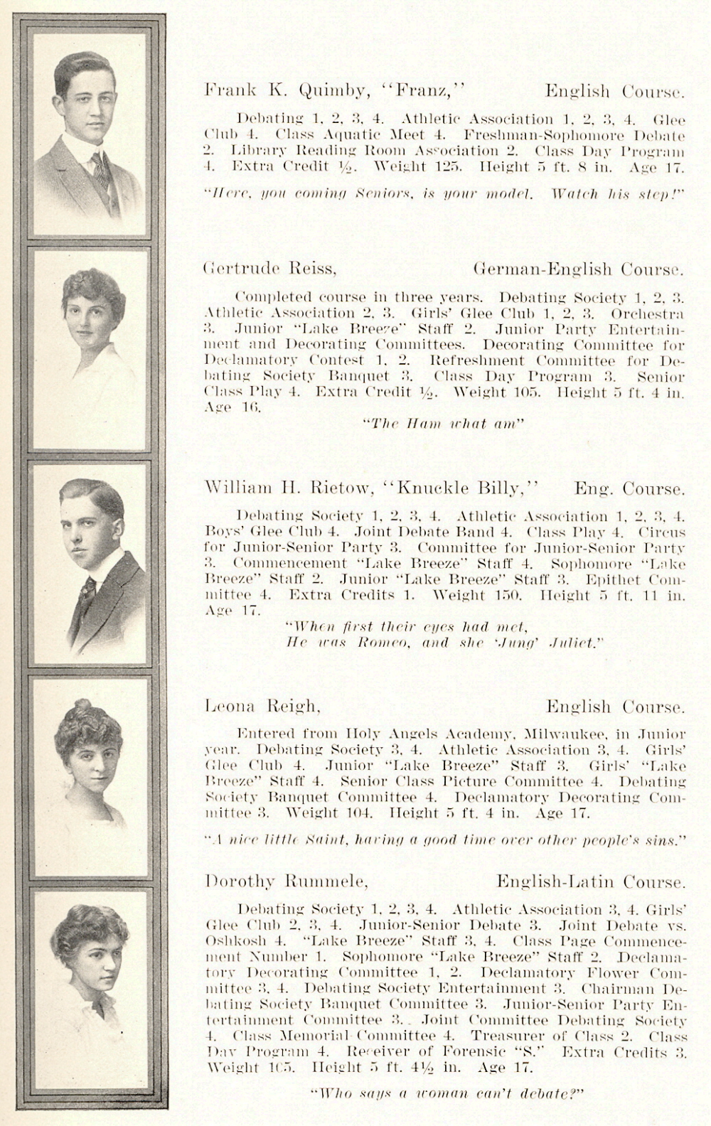 1915 Sheboygan High School, Page 21: Frank K. Quimby, Gertrude Reiss, William H. Rietow, Leona Reigh, Dorothy Rummele.