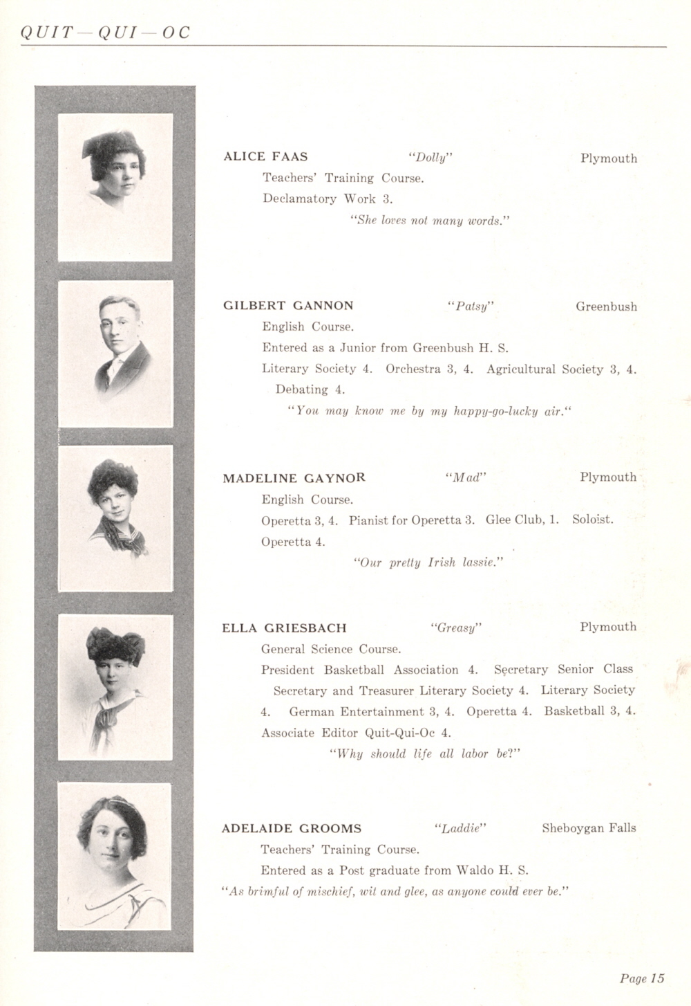 1916 Plymouth High School, Page 15: Alice Faas, Gilbert Gannon, Madeline Gaynor, Ella Griesbach, Adelaide Grooms.