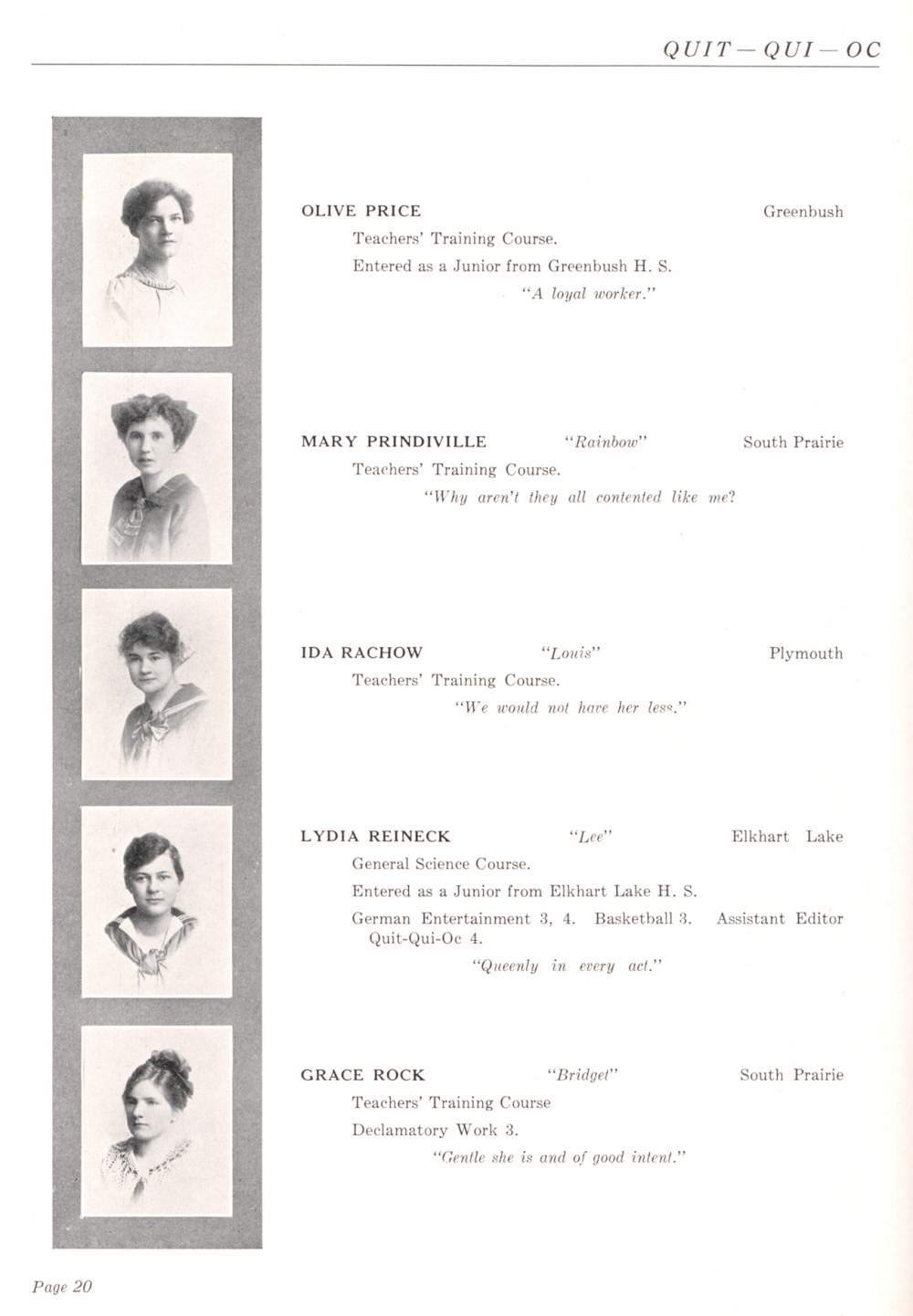1916 Plymouth High School, Page 20: Olive Price, Mary Prindiville, Ida Rachow, Lydia Reineck, Grace Rock.