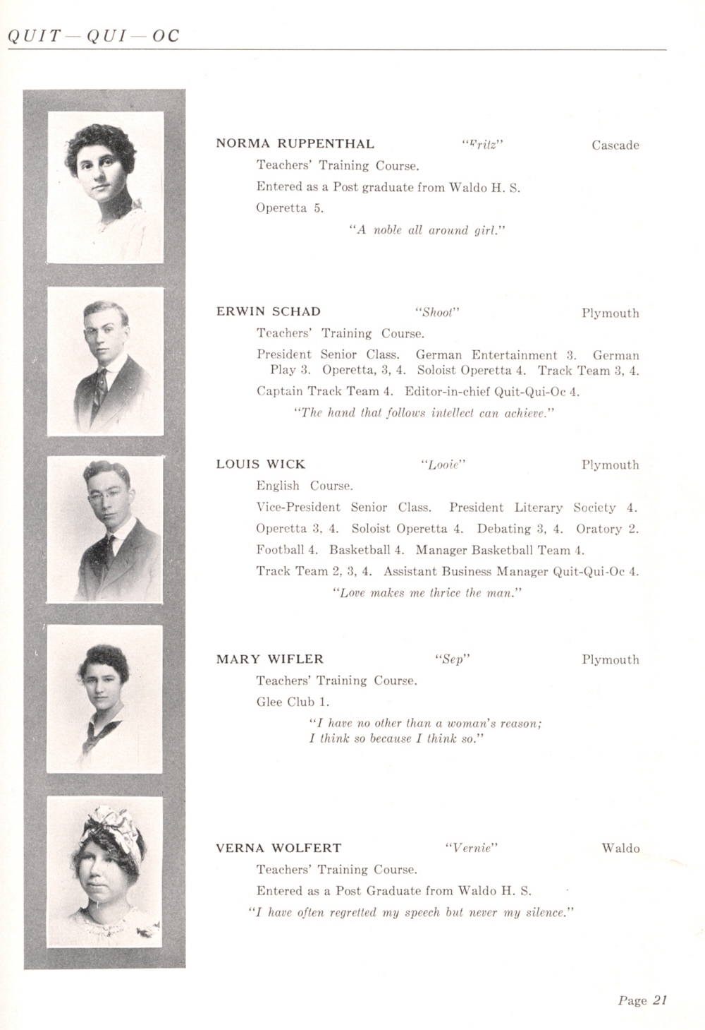 1916 Plymouth High School, Page 21: Norma Ruppenthal, Erwin Schad, Louis Wick, Mary Wifler, Verna Wolfert.