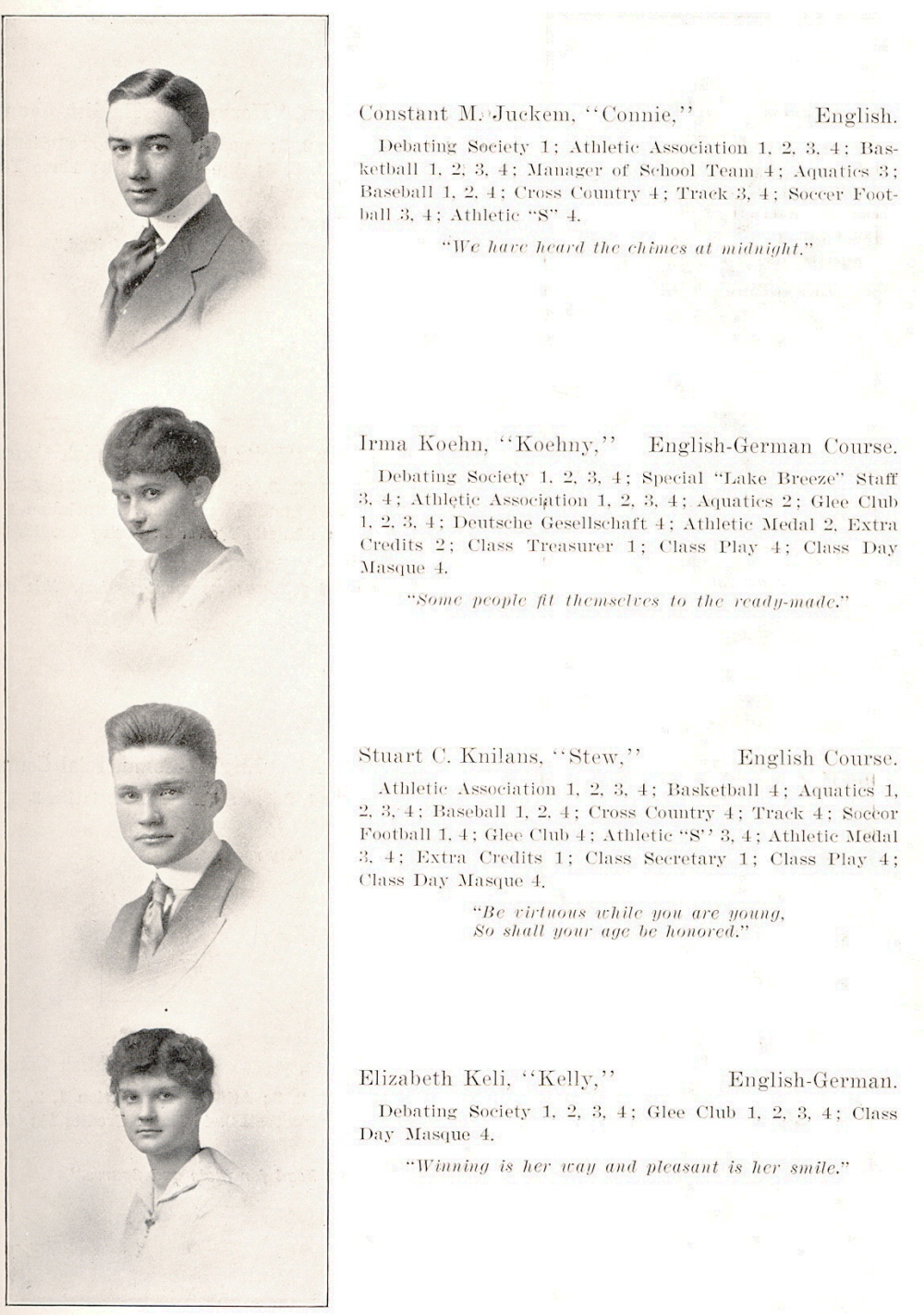 1916 Sheboygan High School, Page 17: Constant M. Juckem, Irma Koehn, Stuart C. Knilans, Elizabeth Keli.